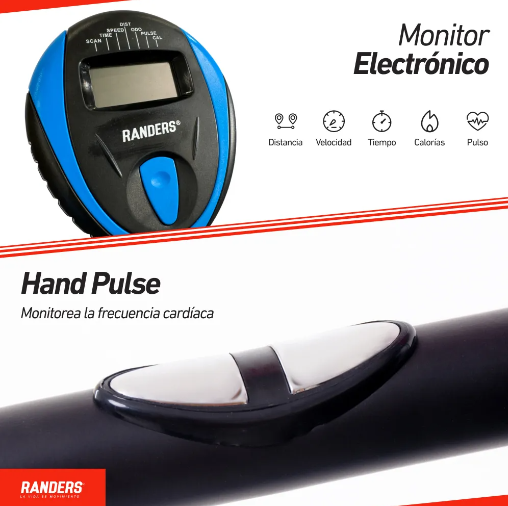 - Consola que muestra Tiempo, Distancia, Velocidad, Calorías quemadas, odómetro y pulso cardíaco.